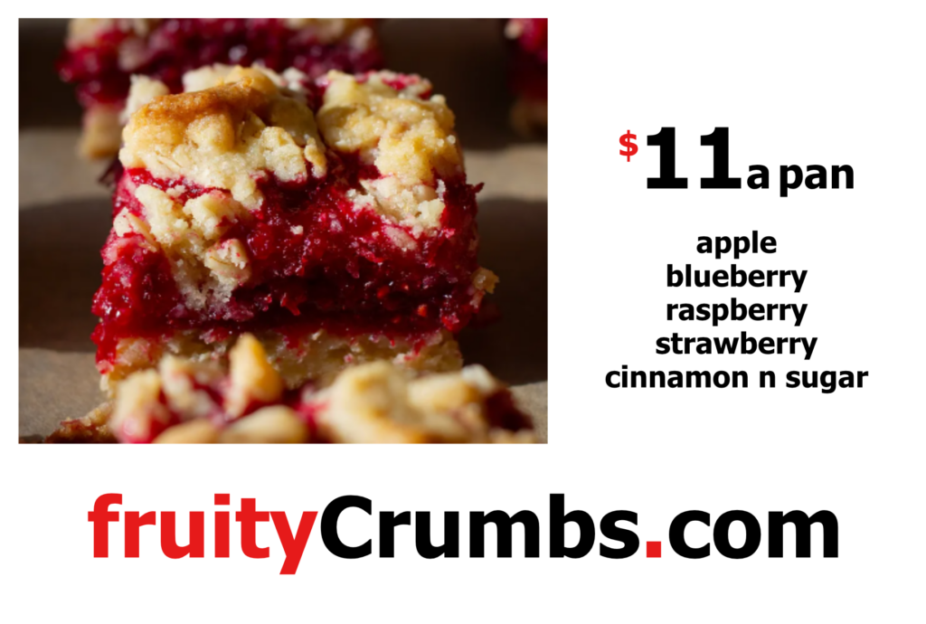 Welcome to fruityCrumbs by amy’s doughnuts, we are in the process of moving and will be open soon. Chose either a cake or oat crumb base with Strawberry, Apple, Raspberry, Blueberry, or Cinnamon and Sugar. All natural ingrediants. fruityCrumbs, Simply delicious.